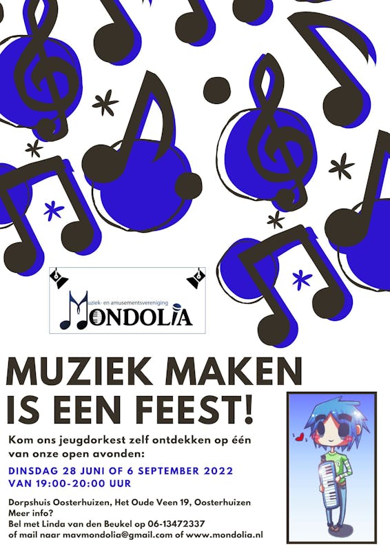 Op dinsdag 6 september 2022 houdt Mondolia een open avond voor kinderen, die muziek willen leren maken en interesse hebben in de vereniging en het jeugdorkest in het bijzonder. De avond begint om 19.00 uur en wordt gehouden in de peuterspeelzaal van het dorpshuis te Oosterhuizen. Kan uw kind nog geen bladmuziek lezen of een instrument bespelen? Geen probleem, ook dan kun je bij de vereniging terecht. Voor meer informatie over het jeugdorkest klik hier.